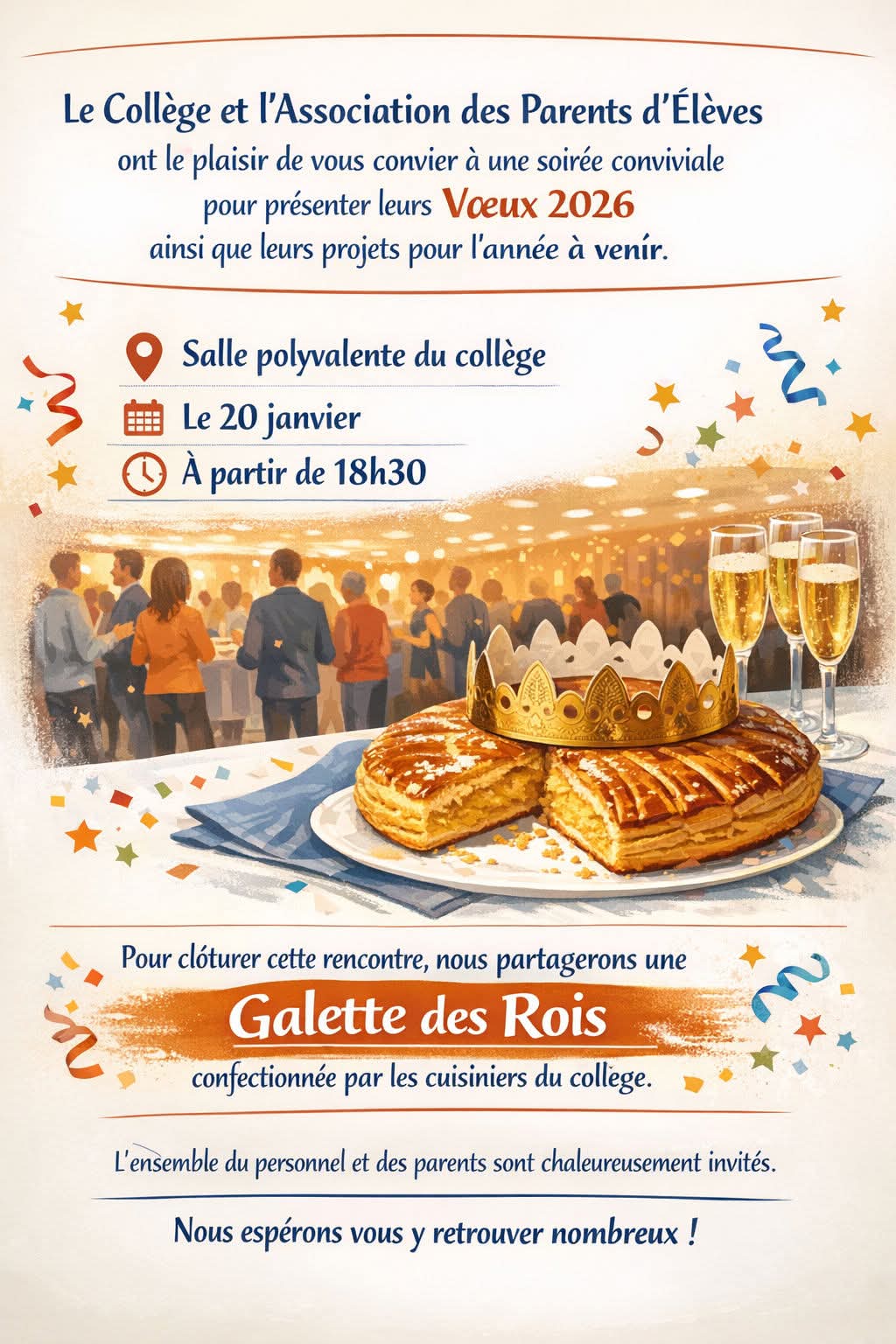 Le collège et l’Association des Parents d’Élèves ont le plaisir de vous convier à un événement convivial pour présenter leurs vœux 2026 ainsi que leurs projets pour l’année à venir...