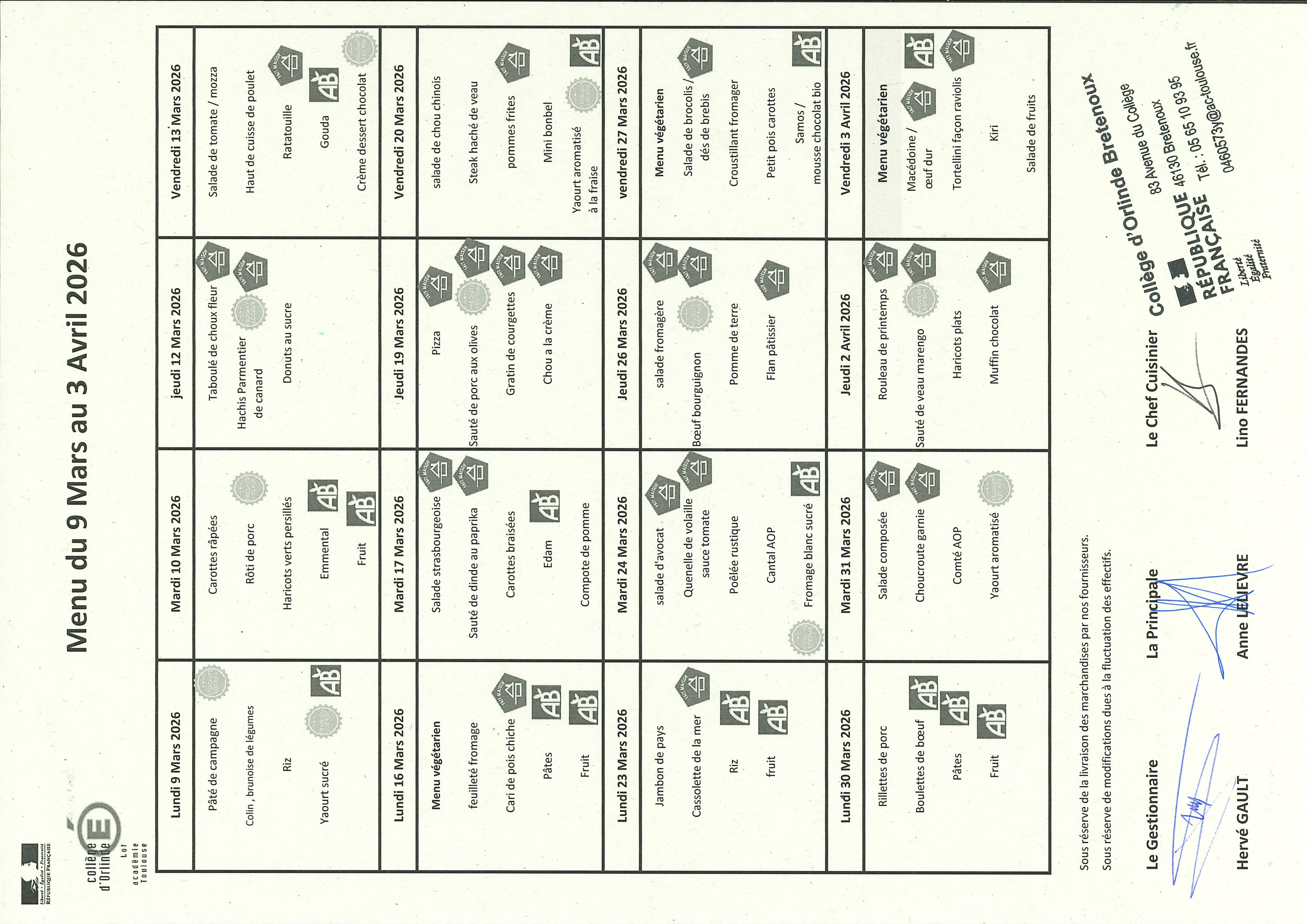 Tickets repas oranges (personnels indice < 447, vacataires, stagiaires, contractuels E.N.): 4€